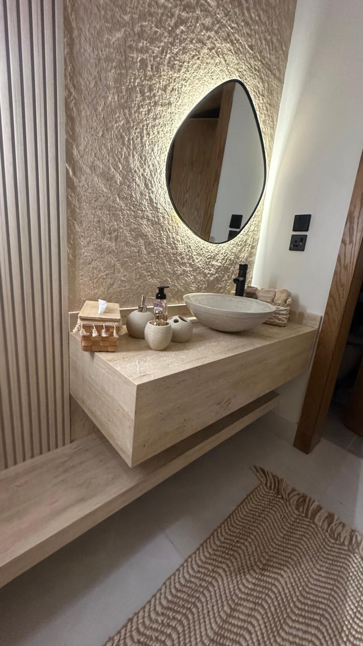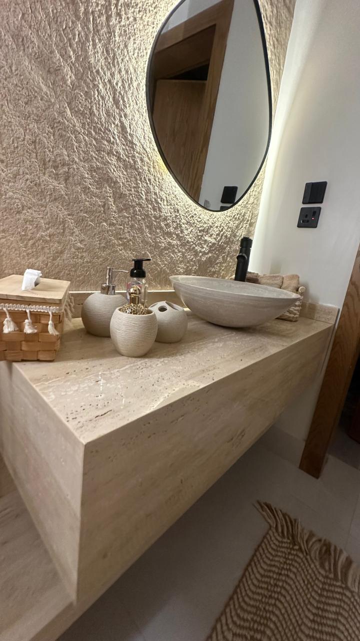 The design features an accent wall made of clay sheets, adding a natural and vibrant character to the space. The washbasin countertop, crafted from treated Travertine marble, stands out for its beauty and strength, making it an ideal choice that combines elegance and practical functionality.
