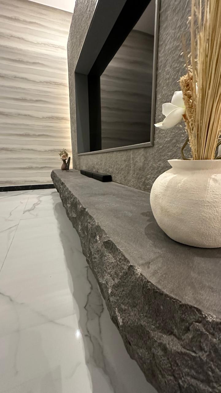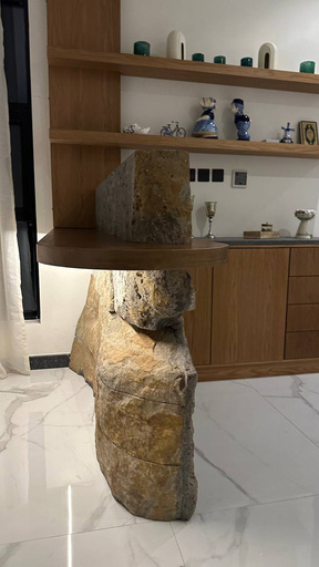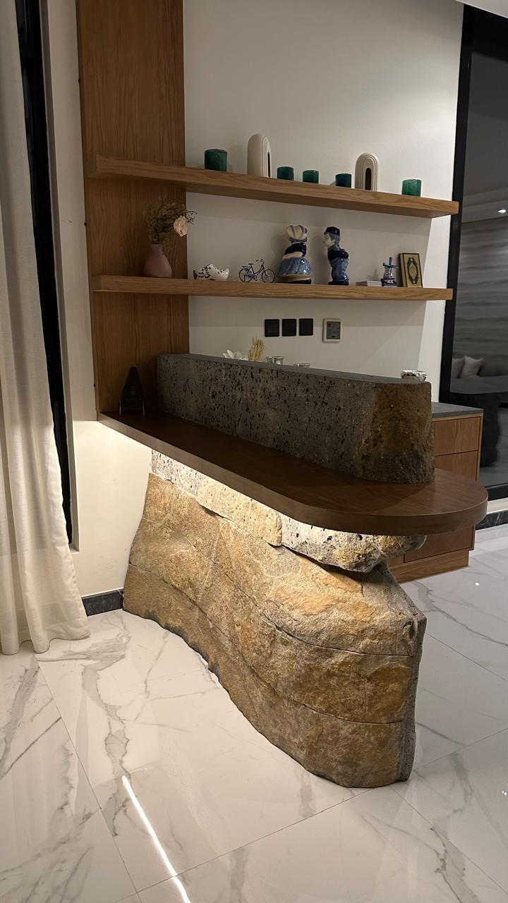 The design features by the use high-quality natural materials, including clay sheets from the TV area, which add a unique aesthetic touch. Additionally, the coffee corner is made of natural oak stone, bringing an element of elegance and comfort. Basalt stone is also used, known for its durability and weather factors resistance, ensuring an artistic design that combines beauty and practical functionality.